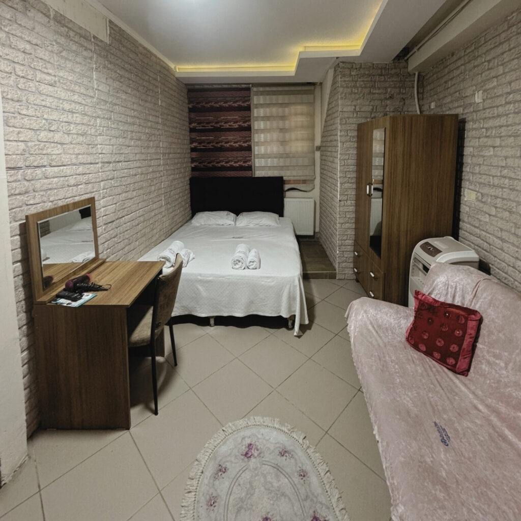 Odada dikkat çeken en güzel detaylardan biri de tavandaki sıcak ahşap dokusu. Öz Butik Otel’in tarihi kimliğini modern çizgilerle buluşturan bu detay, konaklamanıza ayrı bir ruh katıyor. Odanızdan baktığınızda, yemyeşil bahçemizi görebilir, sabah kuş sesleriyle uyanabilirsiniz. Bahçe manzarası, Design Oda’yı tercih eden misafirlerimizin en sevdiği detaylardan biri.